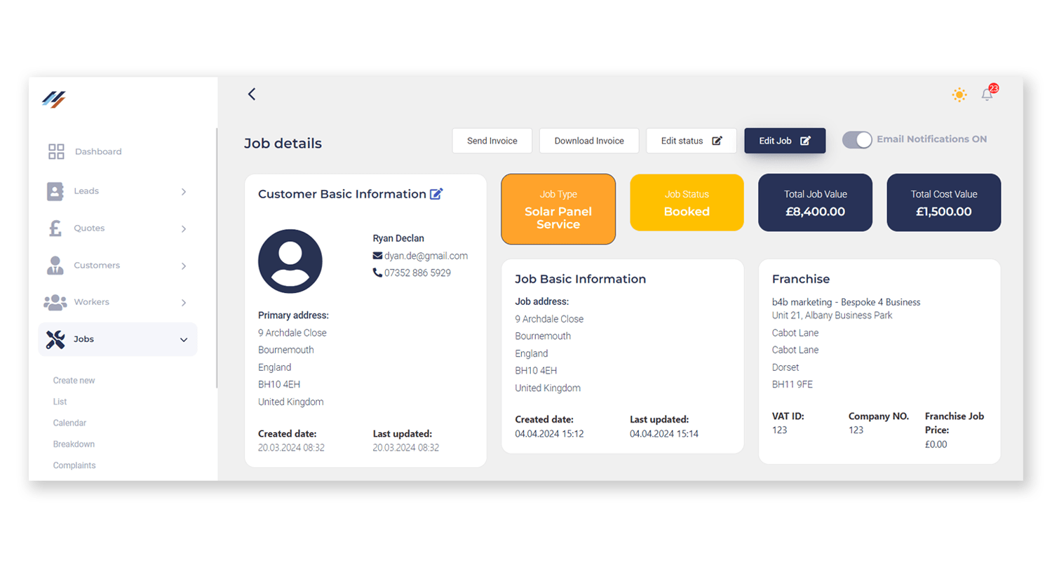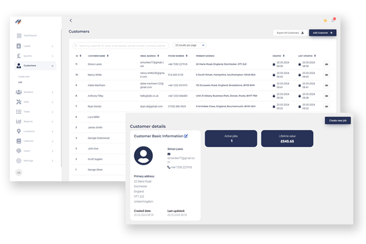 Our customer management module provides a centralised platform for capturing, organising, and accessing essential customer information. With Remoteworkr, you can effortlessly track interactions, view active jobs, and view customer lifetime value to your business. Our intuitive tools enable you to deliver timely solutions and exceed customer expectations at every touchpoint.